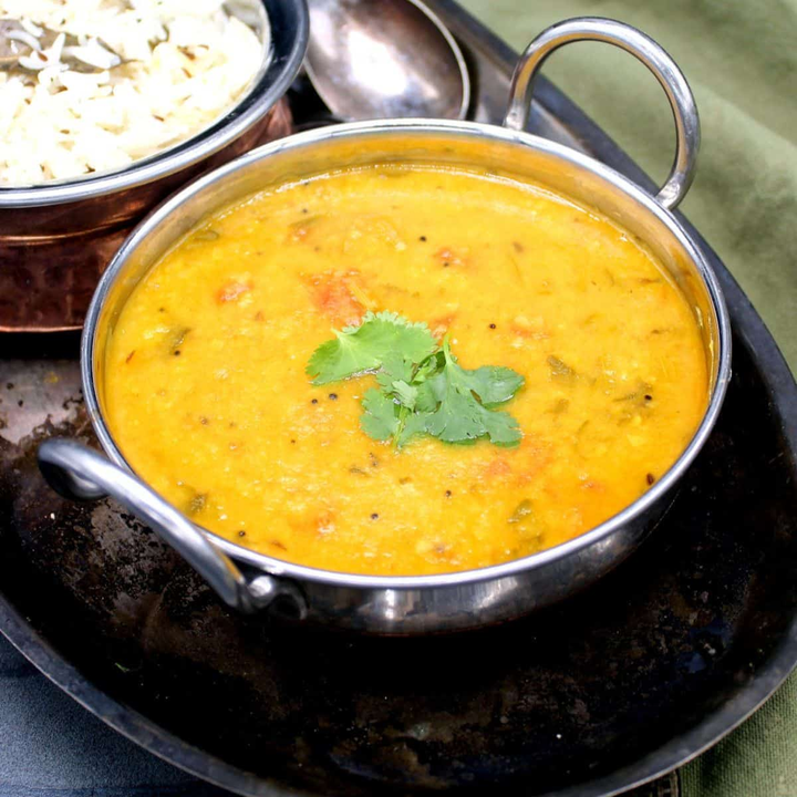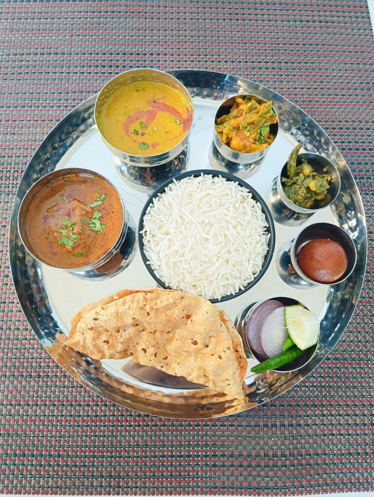 Steam Rice, Black Dal / Dal Fry / Paneer Masala / Seasonal Saag / Tomato Chutney / Til ko Achaar / Seasonal Vegetables / Karela Fry / Papad / Dahi & Rasgulla / Sel Roti