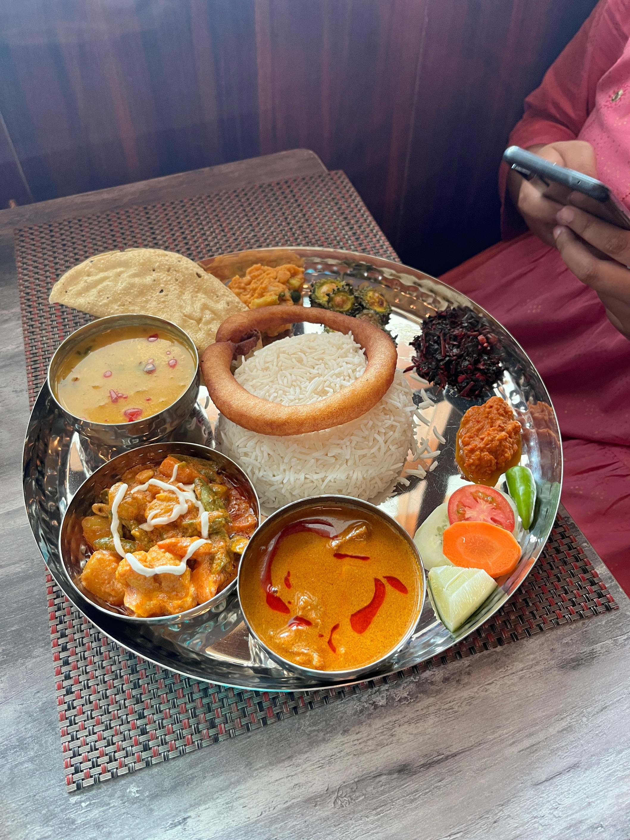 Steam Rice, Black Dal / Dal Fry / Mutton Curry / Seasonal Saag / Tomato Chutney / Til ko Achaar / Seasonal Vegetables / Karela Fry / Papad / Dahi & Rasgulla / Sel Roti